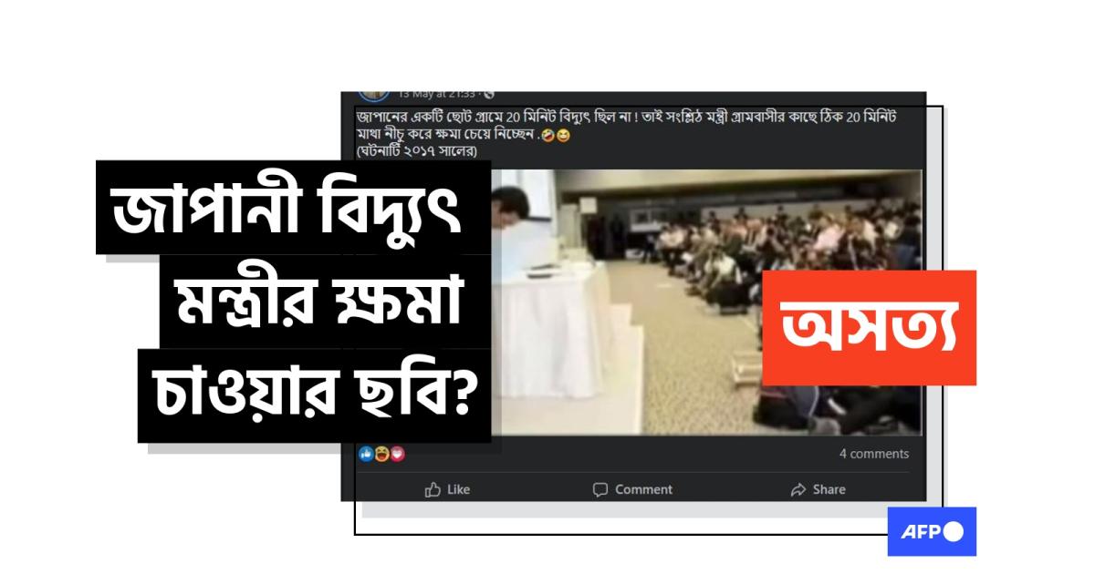 পোস্টটির ক্যাপশনে ভুল বানানে বাংলায় লেখা রয়েছে, “জাপানের একটি ছোট গ্রামে 20 মিনিট বিদ্যুৎ ছিল না ! তাই সংশ্লিঠ মন্ত্রী গ্রামবাসীর কাছে ঠিক 20 মিনিট মাথা নীচু করে ক্ষমা চেয়ে নিচ্ছেন। (ঘটনাটি ২০১৭ সালের)।”