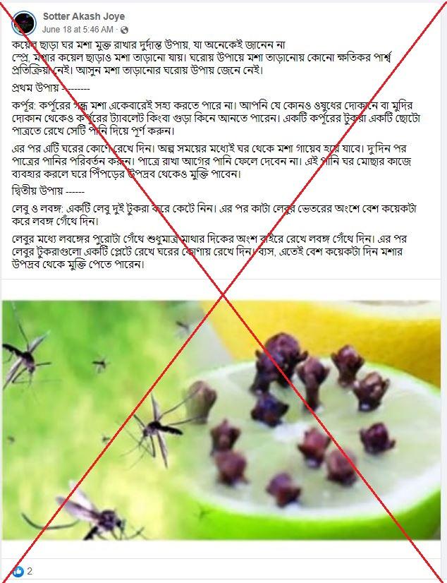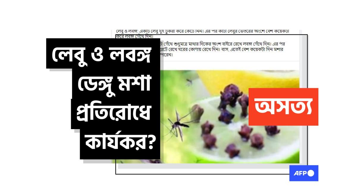 সামাজিক মাধ্যম ফেসবুকে কিছু পোস্টে লেবুর সাথে লবঙ্গ গেথে রাখলে ডেঙ্গু মশার উপদ্রব থেকে বাঁচা যাবে এরকম একটি অসত্য দাবি করা হচ্ছে। জনস্বাস্থ্য বিশেষজ্ঞ ও পতঙ্গবিশারদরা এএফপিকে বলছেন ডেঙ্গুর প্রতিরোধক হিসেবে এই পদ্ধতির কথা ছড়ানো উচিত নয়।