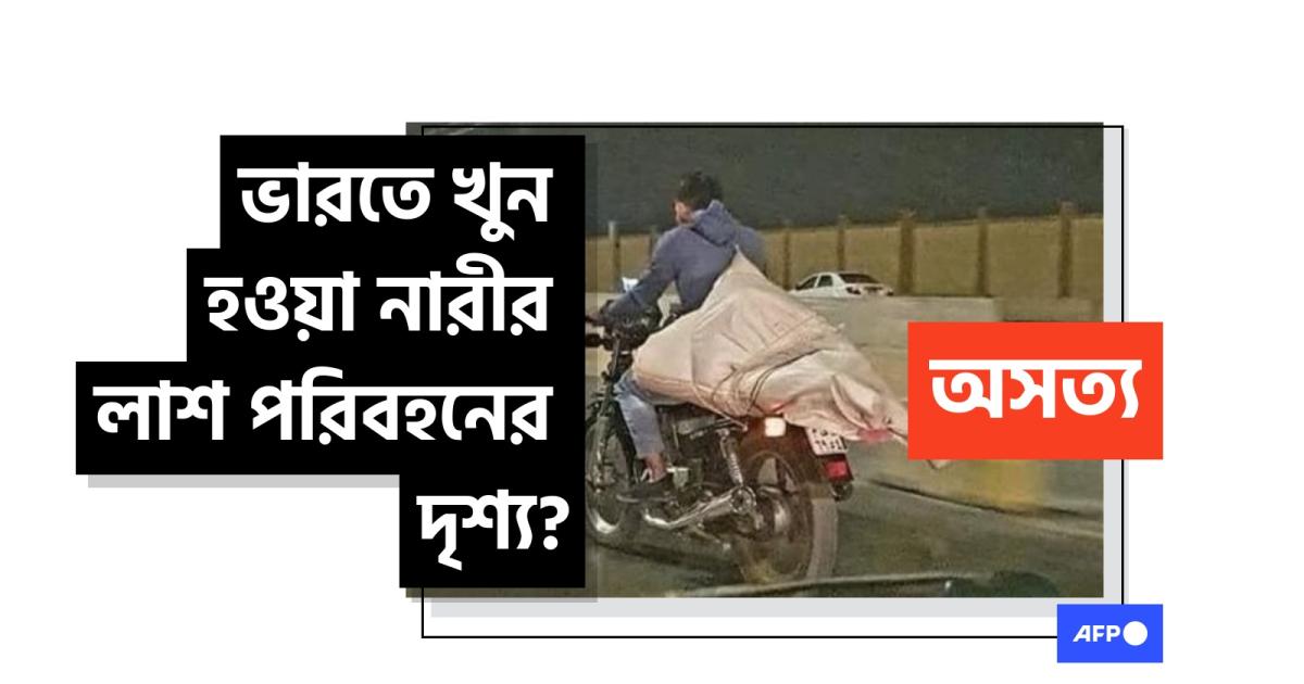 সামাজিক যোগাযোগ মাধ্যমে একাধিক পোস্টে একটি ছবি শেয়ার করে দাবি করা হচ্ছে এটি ২০২৩ সালের জুন মাসে ভারতের রাজস্থানে এক নারীকে হত্যার পর তার লাশ মোটারবাইকের পেছনে বয়ে নিয়ে যাচ্ছেন খুনি। কিন্তু ছবিটি মূলত পোশাক প্রদর্শনের জন্য ব্যবহৃত একটি মূর্তি বা কাঠের পুতুল ডেলিভারির, যা চলতি বছরের মে মাসে মিশরের ঘটনা। বিভ্রান্তিকর দাবিতে ছড়ানোর আগে ছবিটি মিশরের বিভিন্ন সংবাদেও প্রাকাশিত হয়েছে, যাতে বলা হয় দেশটির স্বরাষ্ট্র মন্ত্রণালয় ঘটনাটি তদন্ত করে জেনেছেন যে, মূর্তিটি রাজধানী কায়রোর একটি স্থানে নেয়ার সময় ছবিটি তোলা।