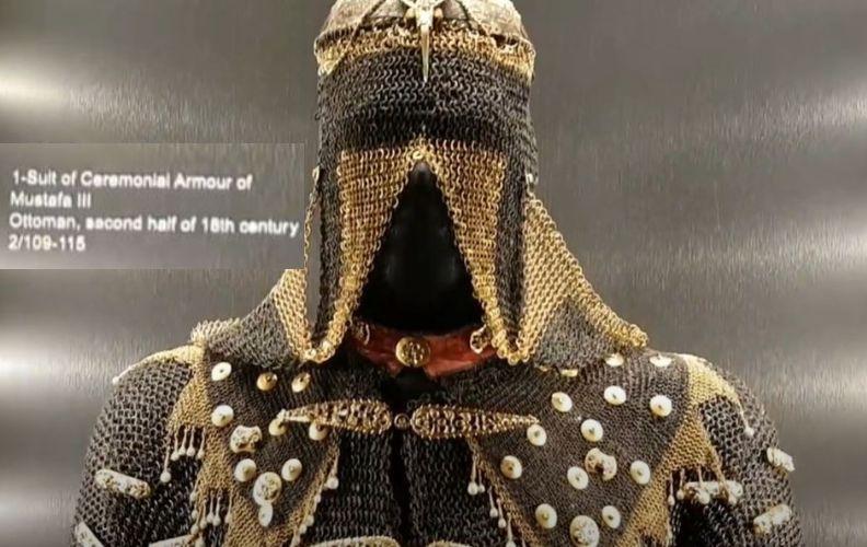 প্রদর্শিত বর্মের ব্যাকগ্রাউন্ড বিবরণীতে ইংরেজিতে লেখা রয়েছে: "১- মুস্তফা তৃতীয় এর বর্ম, উসমানীয়, ১৮তম শতাব্দীর দ্বিতীয়ার্ধ।"