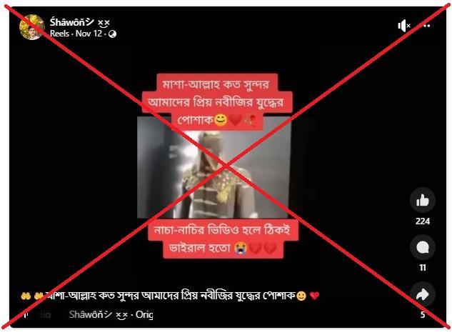 গত ১২ নভেম্বর ফেসবুকে এখানে শেয়ার করা একটি ভিডিও পোস্টে বলা হয়: "মাশা-আল্লাহ কত সুন্দর আমাদের প্রিয় নবীজির যুদ্ধের পোশাক"।