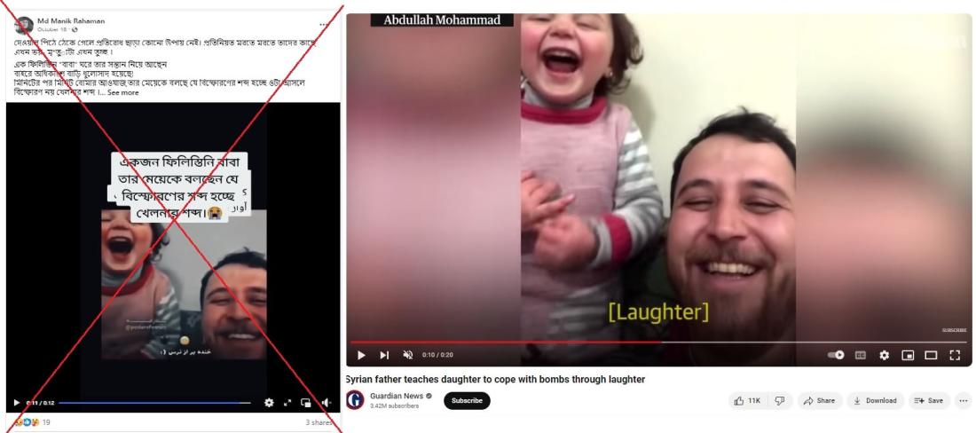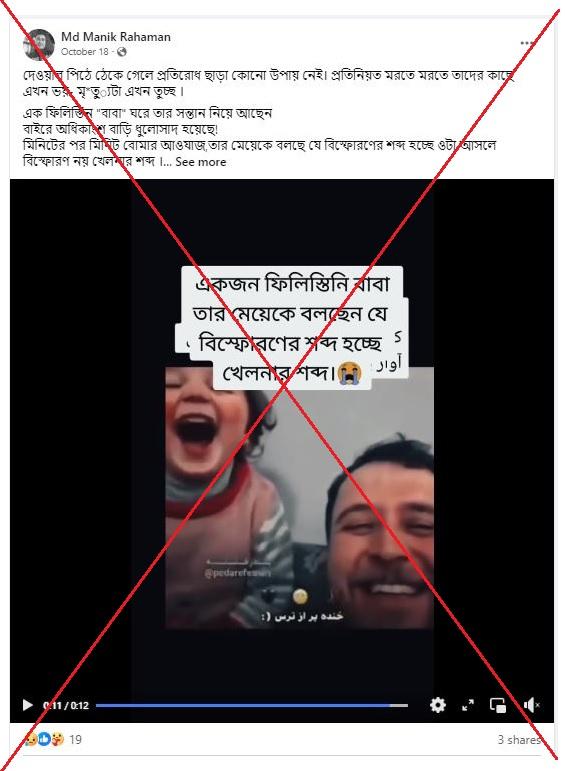 গত ১৮ অক্টোবর ফেসবুকে এখানে আপলোড করা একটি পোস্টের ক্যাপশনে বলা হয়: "একজন ফিলিস্তিনি বাবা তার মেয়েকে বলছেন যে বিস্ফােরণের শব্দ হচ্ছে খেলনার শব্দ।"