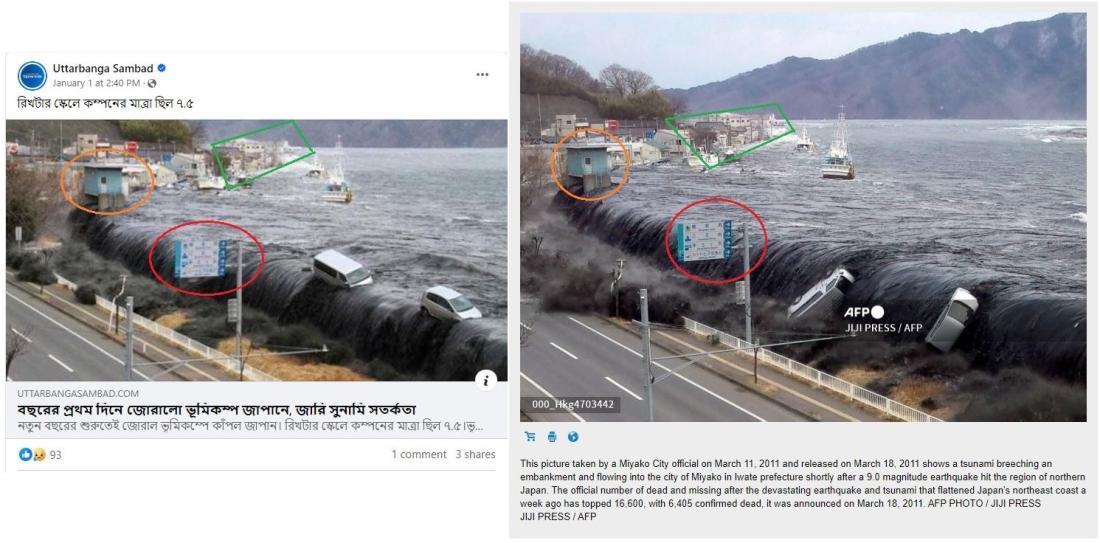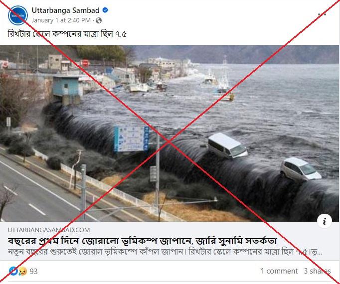 শক্তিশালী সামুদ্রিক ঢেউয়ের সাথে উপকূলীয় বাঁধের ওপর রাখা গাড়ি ভেসে যাওয়ার একটি ছবিকে চলতি বছরের জানুয়ারির ১ তারিখে জাপানে আঘাত হানা সুনামির সাথে অসত্যভাবে সম্পৃক্ত করে বাংলাদেশের সংবাদমাধ্যম এবং সামাজিক মাধ্যমে শেয়ার করা হয়েছে। প্রকৃতপক্ষে, ছবিটি ২০১১ সালে জাপানে আঘাত হানা বিধ্বংসী ভূমিকম্প এবং সুনামির সময় ধারণ করা।