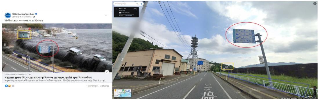 নিচে অসত্য দাবিতে অনলাইন সংবাদমাধ্যমে শেয়ার করা পোস্টের ছবি (বামে) এবং এএফপির ধারণ করা ২০১১ সালের সুনামির ছবির (ডানে) তুলনামূলক স্ক্রিনশট দেয়া হলো: