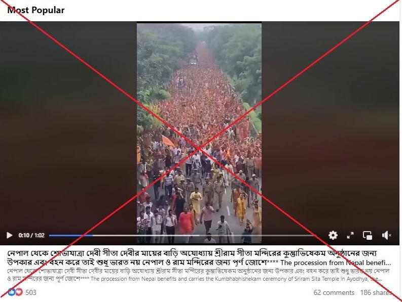 জাফরান রঙের পোশাক পরিহিত লোকজনের বিশাল একটি সমাবেশের ভিডিওকে ভারতের উত্তর প্রদেশের অযোধ্যায় গত ২২ জানুয়ারি উদ্বোধন হওয়া বিতর্কিত রাম মন্দিরের জন্য নেপাল থেকে ভক্তরা উপহার নিয়ে যাচ্ছেন বলে সামাজিক মাধ্যমে বিভ্রান্তিকর দাবিতে প্রচার করা হয়েছে। ভিডিওটি কয়েক হাজারবার দেখা হয়েছে। তবে মন্দিরটি উদ্বোধনের আগে নেপাল থেকে কিছু হিন্দু ধর্মানুসারী ভারতে গেলেও, প্রকৃতপক্ষ্যে ভিডিওটি ২০২৩ সালের জুলাইয়ে একজন হিন্দু ধর্মযাজকের অনুষ্ঠানে গমনকারী তার অনুসারীদের।