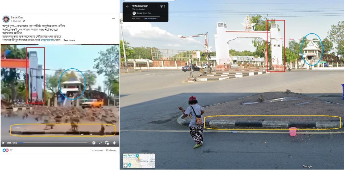 এএফপি ফেসবুক পোস্টের ভিডিওতে দৃশ্যমান রাস্তার পাশের অবকাঠামো এবং লোপবুরি শহরের থা হিন এলাকার অবকাঠামোর মধ্যে মিল খুঁজে পেয়েছে (আর্কাইভ এখানে)।
