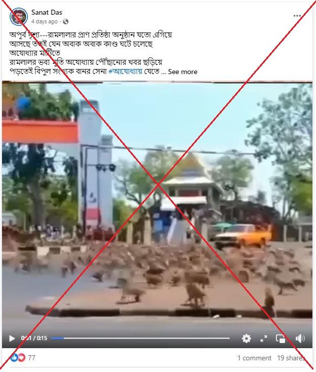 রাস্তায় লড়াইরত একদল বানরের ভিডিওকে ভারতের ঐতিহাসিক বাবরি মসজিদের ধ্বংসাবশেষের উপর নির্মিত বিতর্কিত রাম মন্দিরমুখী বানর দলের অভিযাত্রা বলে অসত্য দাবি সহকারে ফেসবুকে শেয়ার করা হয়েছে। ভিডিওটি কয়েক হাজারবার দেখা হয়েছে। প্রকৃতপক্ষে, ভিডিওটি রাম মন্দির উদ্বোধনের চার বছর আগে ২০২০ সালে থাইল্যান্ডে ধারণ করা। করোনা মহামারির সময়ে এক টুকরো খাবার নিয়ে লড়াইরত ক্ষুধার্ত বানর দলের ভিডিও এটি।