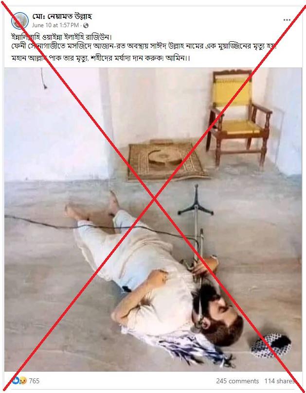 গত ১০ জুন, ২০২৪ একটি ফেসবুক পোস্টের ক্যাপশনে বলা হয়, "ফেনী সোনাগাজীতে মসজিদে আজান-রত অবস্থায় সাঈদ উল্লাহ নামের এক মুয়াজ্জিনের মৃত্যু হয়! মহান আল্লাহ পাক তার মৃত্যু, শহীদের মর্যাদা দান করুক! আমিন।"