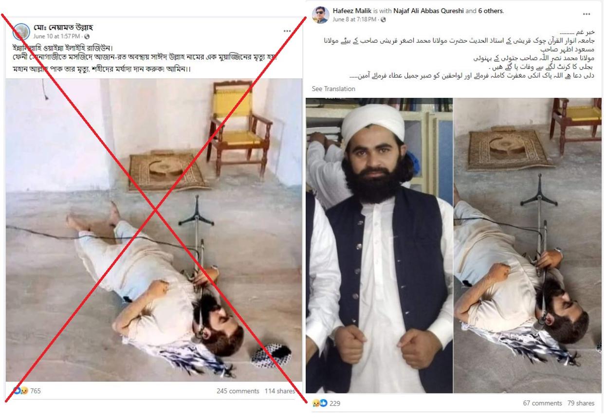 একটি ঘরের মেঝেতে স্থবির হয়ে শুয়ে থাকা একজন ব্যক্তির ছবি ফেসবুক পোস্টে বারবার শেয়ার করে অসত্যভাবে সেটিকে বাংলাদেশের দক্ষিণাঞ্চলে আজান দেয়ার সময় নিহত ব্যক্তির ছবি বলে দাবি করা হয়েছে। তবে নিহত ব্যক্তির পরিবারের একজন সদস্য এবং স্থানীয় পুলিশের মুখপাত্র এএফপিকে জানিয়েছেন, তিনি আসলে পাকিস্তানের পাঞ্জাব প্রদেশের মুজাফফরগড়ের বাসিন্দা।