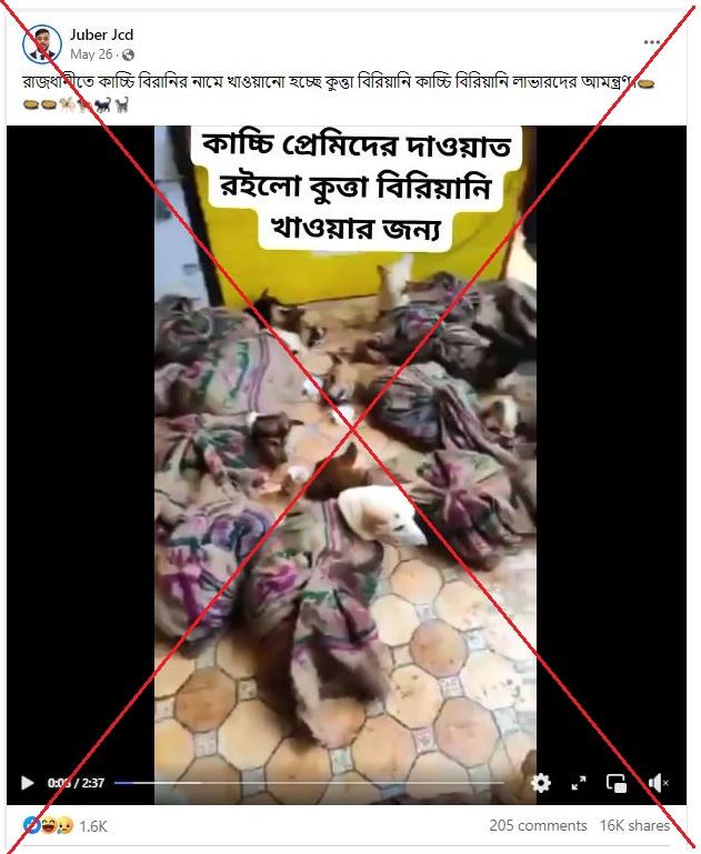 গত ২৬ মে ২০২৪ একটি ফেসবুক পোস্টে শেয়ার করা ভিডিওটির ক্যাপশনে বলা হয়, "রাজধানীতে কাচ্চি বিরানির নামে খাওয়ানো হচ্ছে কুত্তা বিরিয়ানি। কাচ্চি বিরিয়ানি লাভারদের আমন্ত্রণ।"