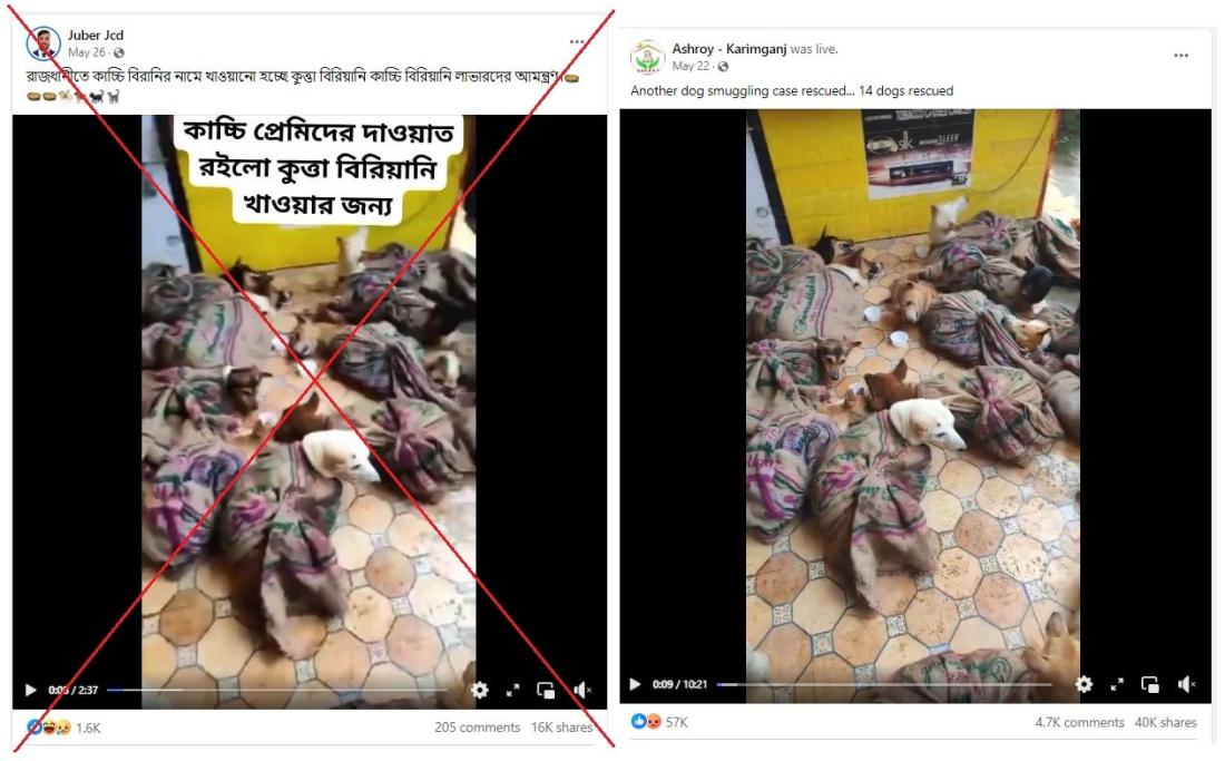 গত বছর বাংলাদেশের রাজধানী ঢাকায় একটি বিরিয়ানি চেইনের একটি শাখায় কুকুরের মাংস পরিবেশনের অভিযোগ ওঠার পর সম্প্রতি ফেসবুকে একটি ভিডিও ছড়িয়ে সেটিকে অসত্যভাবে 'ঢাকা রেস্তোরাঁ' থেকে উদ্ধারকৃত কুকুরের ভিডিও বলে দাবি করা হয়েছে। তবে ভিডিওটি ভারতের আসাম রাজ্যে একটি কুকুর চোরাচালান জব্দের ঘটনার, বাংলাদেশের নয়। এদিকে সরকারি তদন্তে বিরিয়ানি চেইনশপটির খাবারে কুকুরের মাংস পরিবেশনের কোন প্রমাণ মেলেনি।