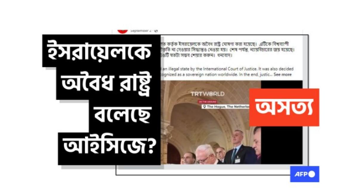গত ২ সেপ্টেম্বর ২০২৪ একটি ফেসবুক পোস্টের ক্যাপশনে বলা হয়, "ব্রেকিং নিউজ। আন্তর্জাতিক বিচার আদালত কর্তৃক ইসরায়েলকে অবৈধ রাষ্ট্র ঘোষণা করা হয়েছে।"