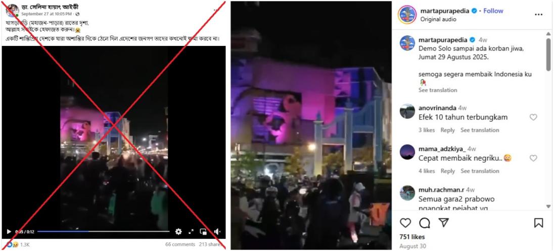ইন্দোনেশিয়ান ভাষার ক্যাপশনে বলা হয় যে ফুটেজটিতে ২৯ আগস্ট, ২০২৫ তারিখে মধ্য জাভার একটি শহর সোলোতে হওয়া একটি বিক্ষোভ দেখানো হয়েছে, যা আনুষ্ঠানিকভাবে সুরকার্তা নামে পরিচিত।