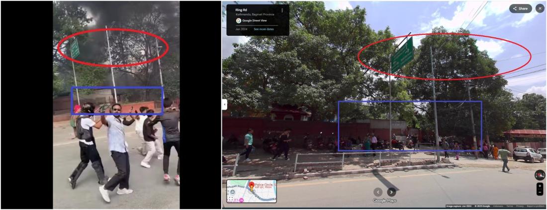 এএফপির অনুসন্ধানে অসত্যভাবে ছড়ানো ভিডিওটির সাথে কাঠমান্ডুর রিং রোড এলাকার পুলিশ স্টেশনের গুগল স্ট্রিট ভিউ ছবির মিল পাওয়া যায় (আর্কাইভ লিংক)।