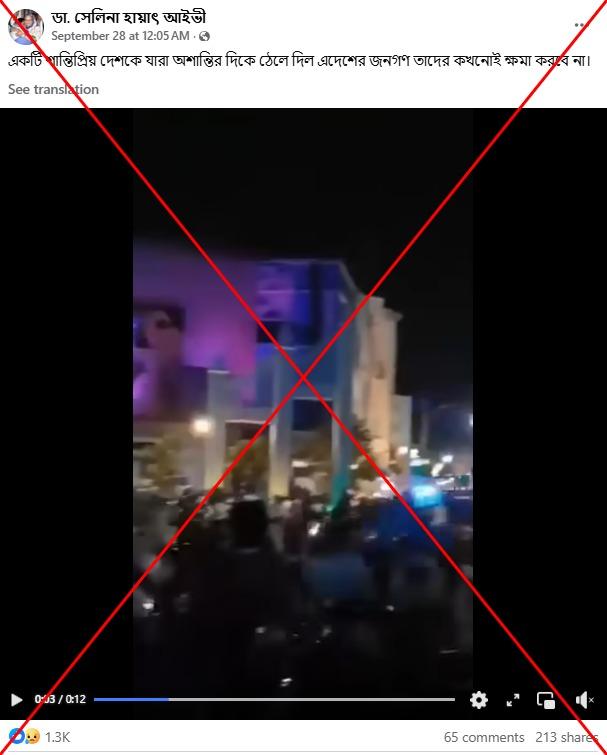 ২৭ সেপ্টেম্বর ফেসবুকে আরেকটি ভিডিও প্রকাশিত হয়, একটি বিশৃঙ্খল রাতের বিক্ষোভের দৃশ্য দেখা যায়, যেখানে বিস্ফোরণ এবং জনাকীর্ণ রাস্তায় পুলিশের গাড়ি ছুটে যাওয়ার দৃশ্য দেখা যাচ্ছে। পোস্টটিতে অসত্যভাবে দাবি করা হয় যে এটি খাগড়াছড়ির অস্থিরতার চিত্র।