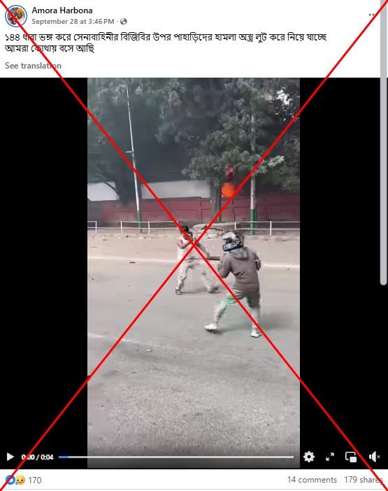 ২৮ সেপ্টেম্বর ২০২৫ তারিখে ৪ সেকেন্ডের একটি ভিডিও শেয়ার করে ফেসবুক পোস্টের ক্যাপশনে বলা হয়, “ ১৪৪ ধারা ভঙ্গ করে সেনাবাহিনী ও বিজিবির ওপর পাহাড়িদের হামলা অস্ত্র লুট করে নিয়ে যাচ্ছে।"