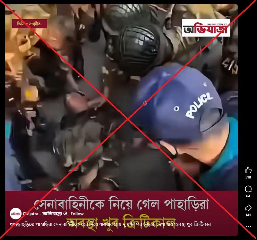 ১ অক্টোবর ২০২৫ তারিখে ছড়ানো একটি ফেসবুক ভিডিওর ক্যাপশনে বলা হয়, “খাগড়াছড়িতে পাহাড়িরা সেনাবাহিনীকে ধরে নিয়ে যাওয়ার প্রায় দু'ঘন্টা পর উদ্ধার, দেখা যায় অবস্থা ক্রিটিকাল।”