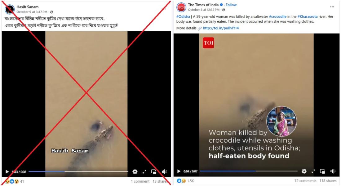 ২০২৫ সালের সেপ্টেম্বর মাসে সুন্দরবনে কুমিরের আক্রমণে একজন জেলে নিহত হন। ওই ঘটনার পর সামাজিক যোগাযোগমাধ্যম ব্যবহারকারীরা একটি ভিডিও ছড়িয়ে সেটিকে কুষ্টিয়া জেলায় অন্য একটি কুমির আক্রমণের দৃশ্য হিসেবে অসত্যভাবে দাবি করা হয়। ক্লিপটি আসলে প্রতিবেশী দেশ ভারতের।
