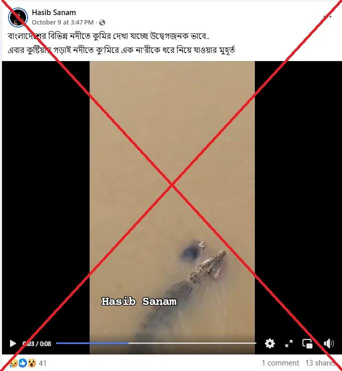 ৯ অক্টোবর ২০২৫ তারিখে ছড়ানো একটি ফেসবুক ভিডিওর ক্যাপশনে বলা হয়, “বাংলাদেশের বিভিন্ন নদীতে কুমির দেখা যাচ্ছে উদ্বেগজনক ভাবে। এবার কুষ্টিয়ায় গড়াই নদীতে কুমিরে এক নারীকে ধরে নিয়ে যাওয়ার মুহূর্ত।”