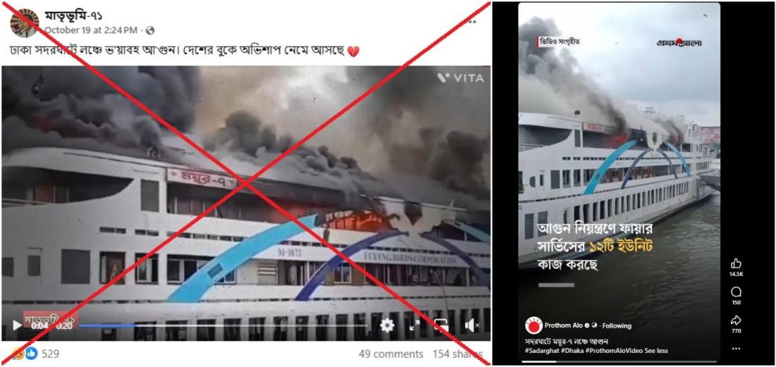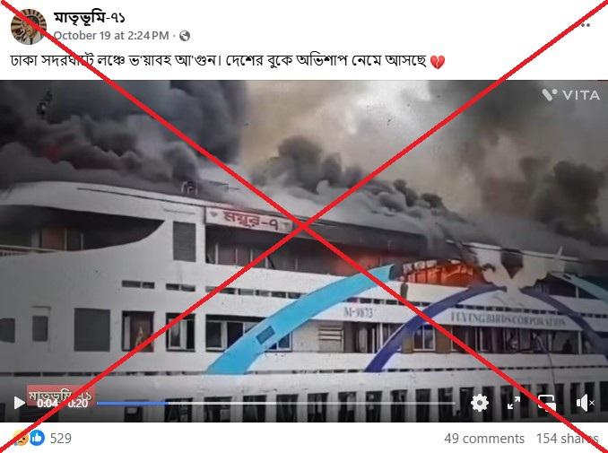 ১৯ অক্টোবর ২০২৫ তারিখে ছড়ানো একটি ফেসবুক ভিডিওর ক্যাপশনে বলা হয়, “ঢাকা সদরঘাটে লঞ্চে ভয়াবহ আগুন। দেশের বুকে অভিশাপ নেমে আসছে।”