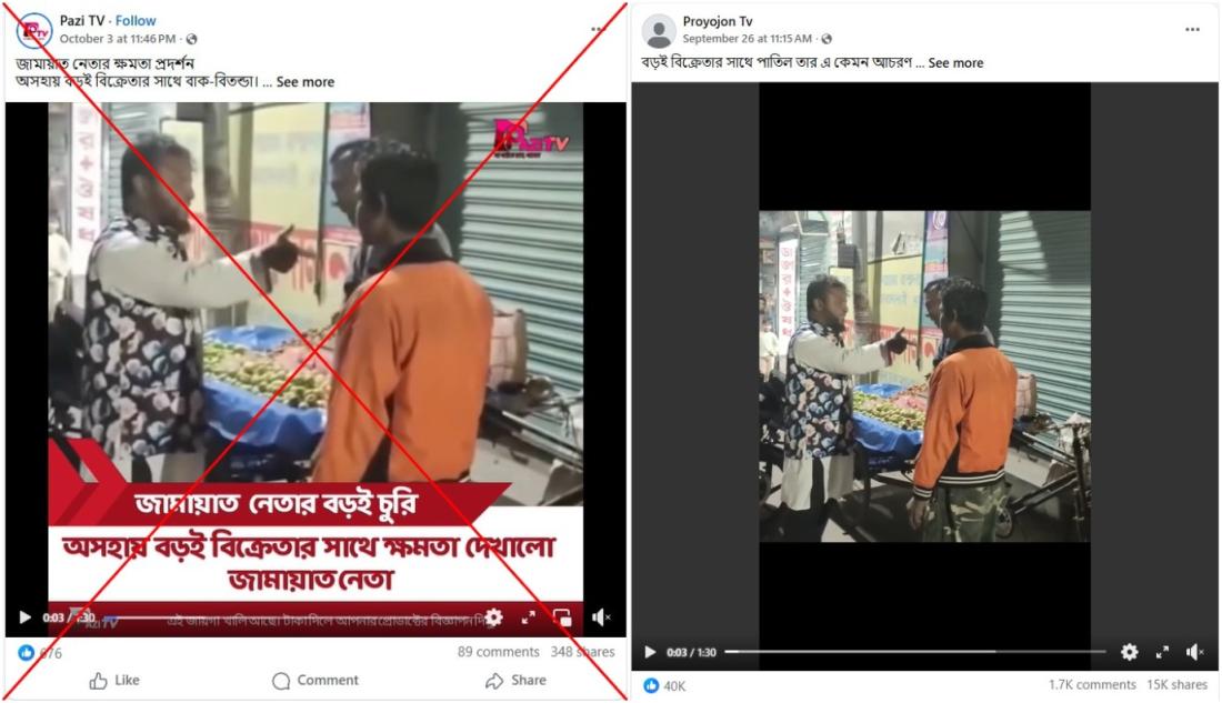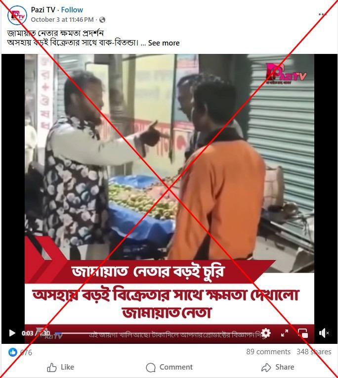 ৩ অক্টোবর ২০২৫ তারিখে ফেসবুকে ছড়ানো একটি পোস্টে বলা হয়, “জামায়াত নেতার ক্ষমতা প্রদর্শন। অসহায় বড়ই বিক্রেতার সাথে বাক-বিতন্ডা। ক্ষমতায় যাবার আগেই এই ঘটনা?”