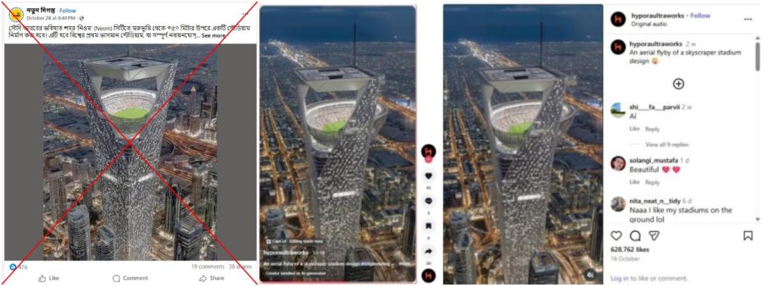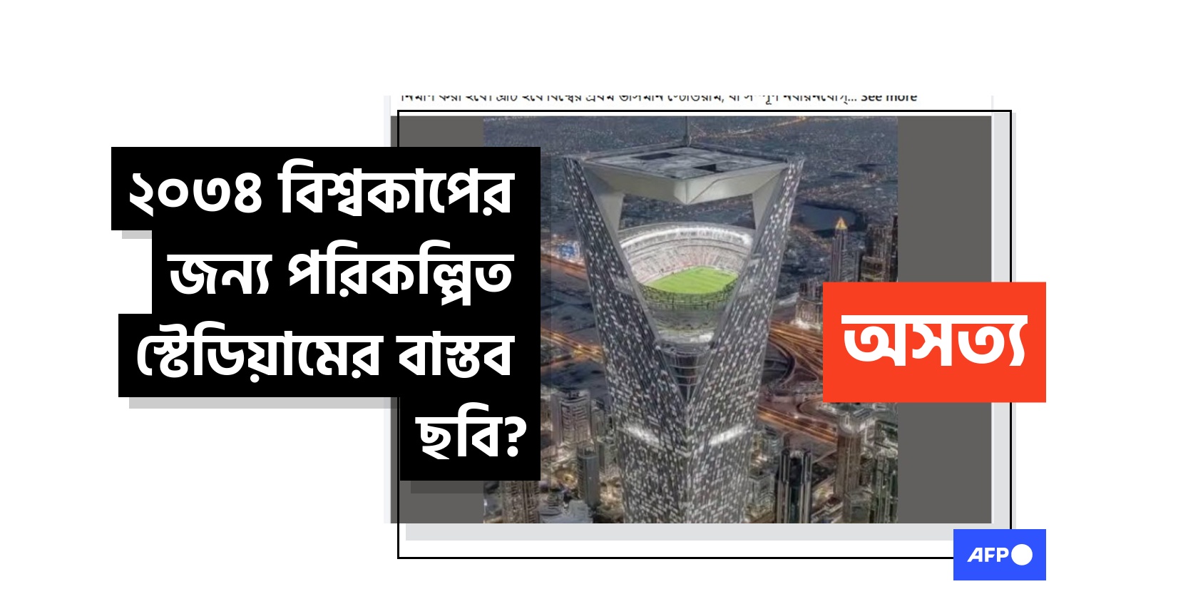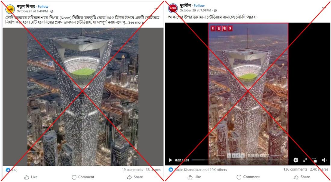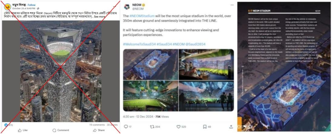 একটি ফেসবুক পোস্টে একটি দীর্ঘ অবকাঠামোর উপরে একটি খোলা ফুটবল স্টেডিয়ামের ছবি যুক্ত করে ক্যাপশনে বলা হয়, “সৌদি আরবের ভবিষ্যত শহর 'নিওম' (Neom) সিটিতে মরুভূমি থেকে ৩৫০ মিটার উপরে একটি স্টেডিয়াম নির্মাণ করা হবে।”
