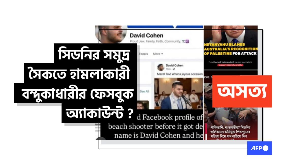 ১৪ ডিসেম্বর সিডনির প্রসিদ্ধ বন্ডাই সৈকতে একটি ইহুদি উৎসবে বন্দুকধারীরা হামলা চালায়। হামলাটি ‘তাদেরই একজন’ চালিয়েছে বলে সামাজিক মাধ্যম ব্যবহারকারীরা অসত্যভাবে দাবি করেন। হামলাকারীদের মধ্যে “ডেভিড কোহেন” নামে একজন ইসরায়েলি ব্যক্তি ছিল বলে অভিযোগ করেন তারা। তবে তার ফেসবুক প্রোফাইল থেকে নেওয়া কথিত ছবিতে এমন কিছু ত্রুটি রয়েছে, যা ছবিগুলোকে এআই তথা কৃত্রিম বুদ্ধিমত্তা দিয়ে তৈরির ইঙ্গিত দেয়। অস্ট্রেলিয়ার গণমাধ্যমগুলো ইতোমধ্যে দেশটির সাম্প্রতিক দশকের মধ্যে সবচেয়ে ভয়াবহ বন্দুক হামলায় অভিযুক্তদের সাজিদ আকরাম এবং তার ছেলে নাভিদ হিসেবে সনাক্ত করেছে।