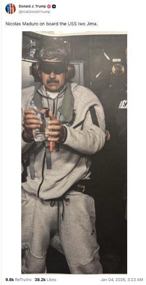 ট্রাম্প ৪ জানুয়ারি ট্রুথ সোশ্যালে একটি ট্র্যাকস্যুট ও সানগ্লাস পরা অবস্থায় "ইউএসএস আইওয়া জিমা-র বোর্ডে" ক্ষমতাচ্যুত প্রেসিডেন্টের একটি ছবি শেয়ার করেন, যেখানে মাদুরোর পোশাকে কোনো রক্ত দেখা যায়নি(আর্কাইভ লিংক)।