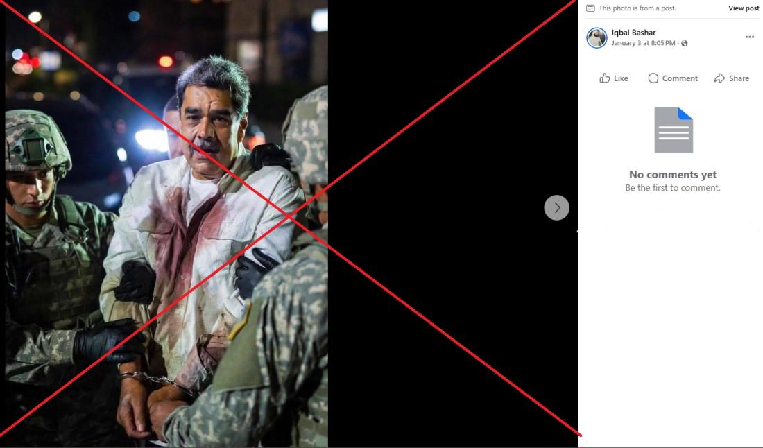 ৩ জানুয়ারি ২০২৬ তারিখে ফেসবুকে ছড়ানো একটি পোস্টের ক্যাপশনে বলা হয়, “আমেরিকা কর্তৃক সন্ত্রাসী সামরিক হামলায় স্বাধীন রাষ্ট্র ভেনেজুয়েলার বর্তমান প্রেসিডেন্ট মাদুরোকে অপহরণ করে বন্দী করা হয়েছে!”