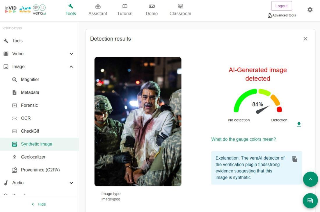 ইনভিড-উইভেরিফাই নামে পরিচিত ভেরিফিকেশন প্লাগইন ব্যবহার করে এক বিশ্লেষণ দেখা যায় হাতকড়া পরা মাদুরোর ছবিটি কৃত্রিম বুদ্ধিমত্তা দিয়ে তৈরি।