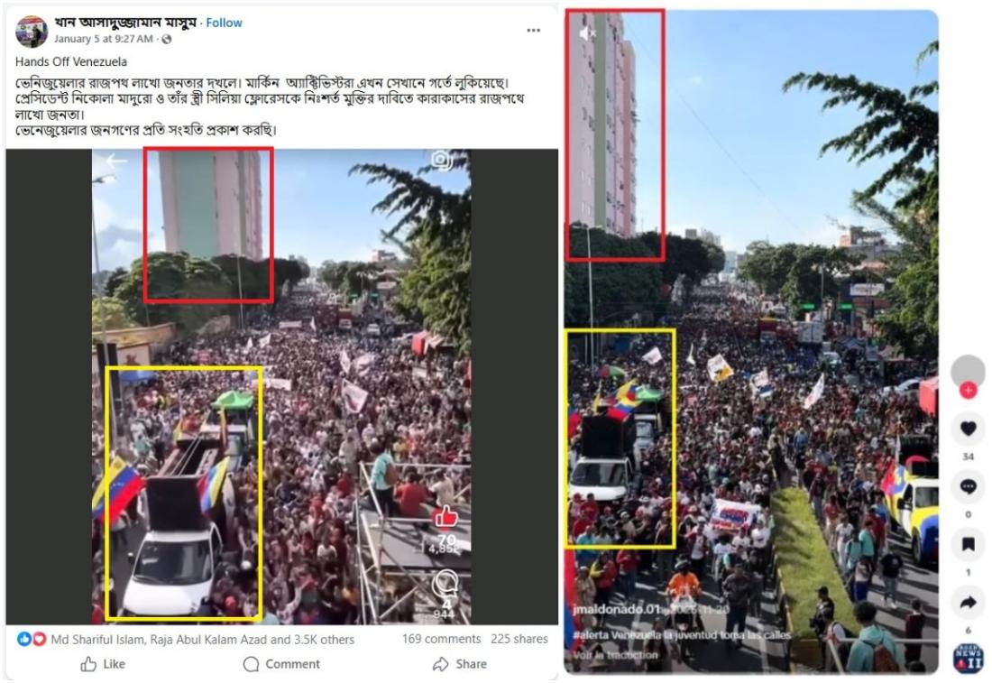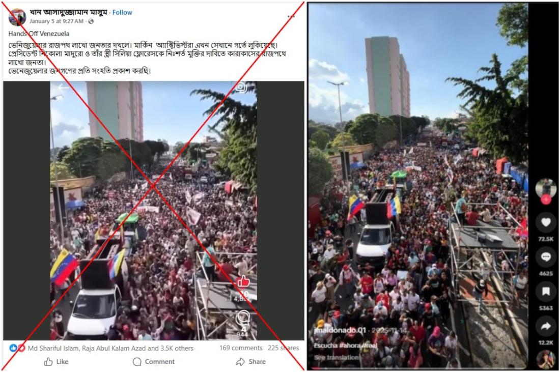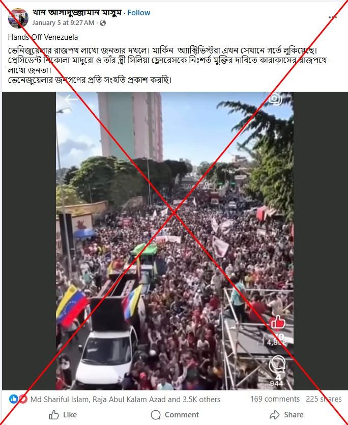 ৫ জানুয়ারি ২০২৬ তারিখে ফেসবুকে ছড়ানো একটি পোস্টের ক্যাপশনে বলা হয়, “প্রেসিডেন্ট নিকোলা মাদুরো ও তাঁর স্ত্রী সিলিয়া ফ্লোরেসকে নিঃশর্ত মুক্তির দাবিতে কারাকাসের রাজপথে লাখো জনতা। ভেনেজুয়েলার জনগণের প্রতি সংহতি প্রকাশ করছি।”