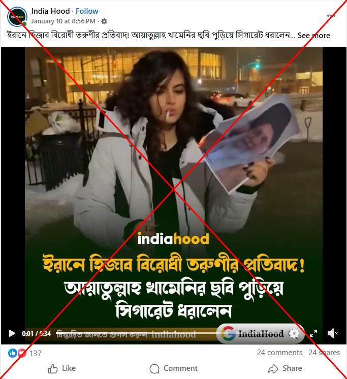 জীবনযাত্রার ক্রমবর্ধমান ব্যয় নিয়ে ক্ষোভ থেকে নতুন বছরের শুরুতে ইরানে বিক্ষোভ ছড়িয়ে পড়ে। বিক্ষোভ দমনে কর্তৃপক্ষ অভিযান শুরু করলে দেশটির ক্ষুব্ধ জনতা রাস্তায় নেমে আসে। এ সময় সামাজিক যোগাযোগমাধ্যমে একটি ভিডিও ছড়িয়ে সেটিকে ইরানের বিক্ষোভে অংশ নেয়া এক নারীর প্রতিবাদের দৃশ্য হিসেবে অসত্যভাবে দাবি করা হয়। প্রকৃতপক্ষে ক্লিপটি ইরানের আন্দোলনের প্রতি সংহতি প্রকাশ করে কানাডায় নির্বাসিত এক ইরানি নারীর প্রতিবাদের দৃশ্য।