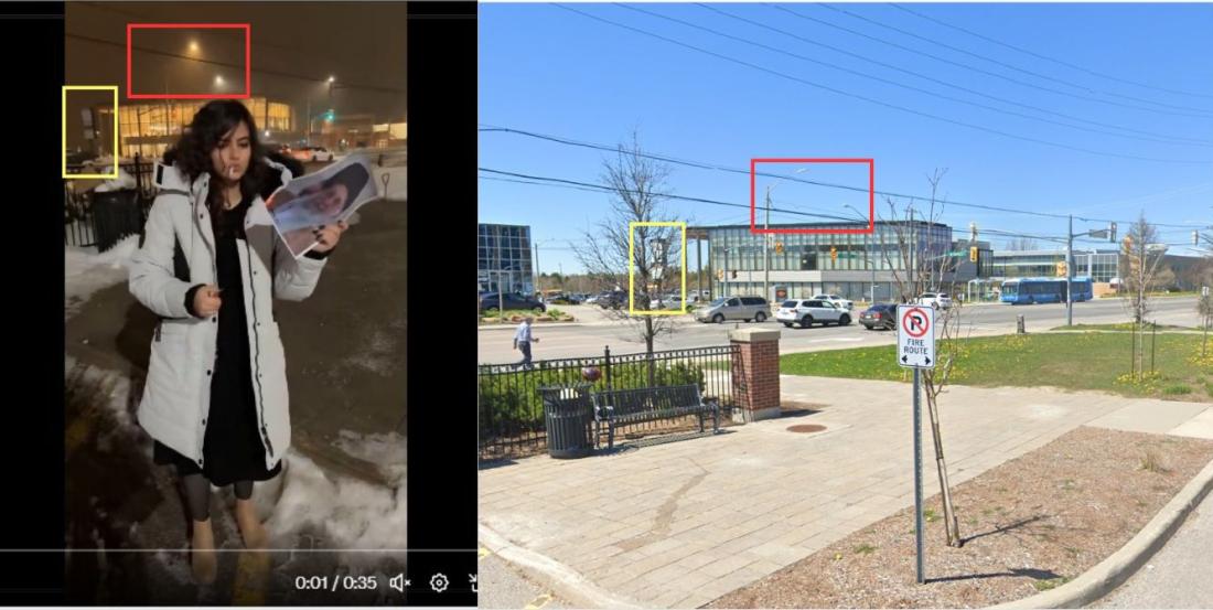 অসত্য ভিডিওটির সাথে টরন্টো শহরের গুগল স্ট্রিট ভিউয়ের ছবির মিল পাওয়া যায় (আর্কাইভ লিংক)।