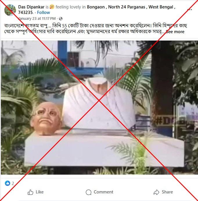 পশ্চিমবঙ্গে মহাত্মা গান্ধীর ক্ষতিগ্রস্ত ভাস্কার্যকে বাংলাদেশে হিন্দু-বিরোধী সহিংসতার সাথে অসত্যভাবে যুক্ত করে প্রচার