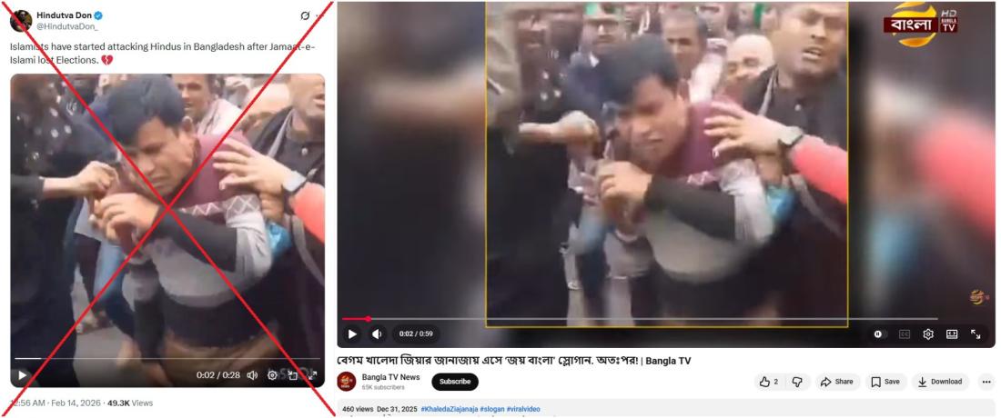 ১৬ ফেব্রুয়ারি ২০২৬ তারিখে ফেসবুকে ছড়ানো একটি পোস্টের ক্যাপশনে বলা হয়, “জামায়াতে ইসলামী নির্বাচনে হেরে যাওয়ার পর থেকে ইসলামপন্থীরা বাংলাদেশে হিন্দুদের উপর আক্রমণ শুরু করেছে।”