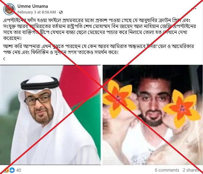 ৩ ফেব্রুয়ারি ২০২৬ তারিখে ছড়ানো একটি ফেসবুক পোস্ট ক্যাপশনে বলা হয়, “এপস্টেইনের ফাঁস হওয়া ফাইলে প্রথমবারের মতো প্রকাশ পাওয়া গেছে যে আবুধাবির ক্রাউন প্রিন্স এবং সংযুক্ত আরব আমিরাতের বর্তমান রাষ্ট্রপতি শেখ মোহাম্মদ বিন জায়েদ আল নাহিয়ান জেফ্রি এপস্টাইনের সাথে তার ব্যক্তিগত দ্বীপে যেখানে বাচ্চা ছেলে মেয়েদের পাচার করে নিলামে তোলা হত সেখানে দেখা করেছেন।”