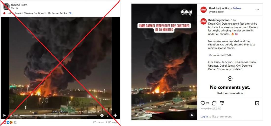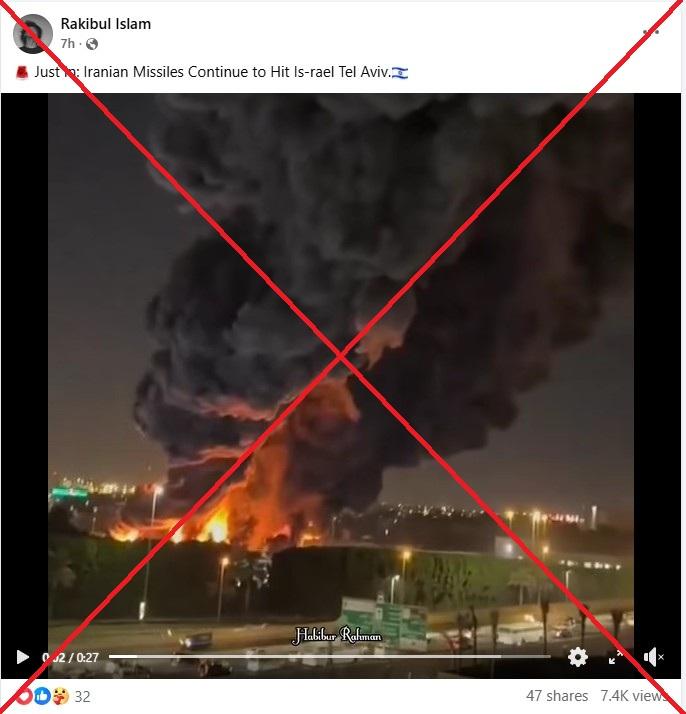 ২৮ ফেব্রুয়ারি ২০২৬ তারিখে মার্কিন যুক্তরাষ্ট্র ও ইসরায়েলের হামলায় ইরানের সর্বোচ্চ নেতা নিহত হন। প্রতিশোধ হিসেবে মধ্যপ্রাচ্য জুড়ে ক্ষেপণাস্ত্র হামলা চালায় ইরান। কিন্তু তেল আবিবে হামলার দাবিতে অনলাইনে ছড়ানো ভিডিওটি সর্বশেষ যুদ্ধ শুরুর আগের। ভিডিওটি ২০২৫ সালের নভেম্বরে দুবাইয়ের একটি গুদামে অগ্নিকাণ্ডের ঘটনার।