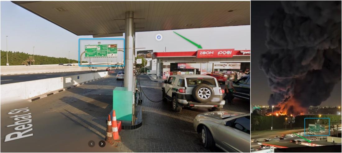 দুবাইয়ের আল রাবাত সড়কের গুগল স্ট্রিট ভিউ ছবির সাথে অনলাইনে ছড়ানো ভিডিওর দৃশ্যের মিল রয়েছে (আর্কাইভ লিংক)।