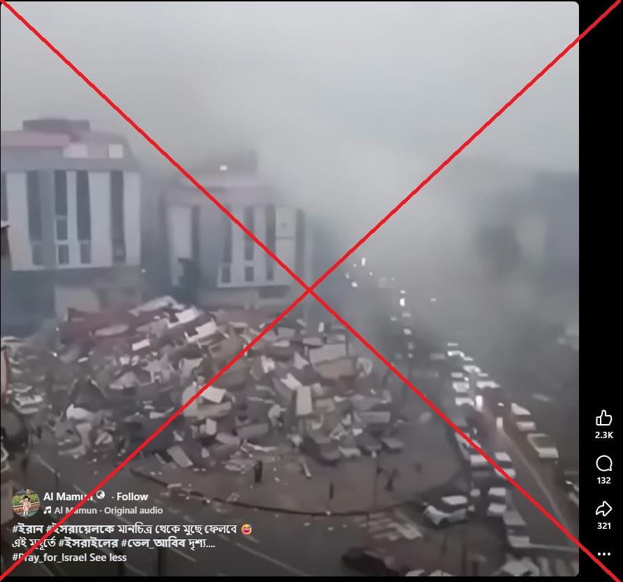 যুক্তরাষ্ট্র ও ইসরায়েল যৌথভাবে ইসলামিক প্রজাতন্ত্র ইরানের ওপর বিমান হামলা চালায়। আক্রান্ত ইরান প্রতিশোধের প্রতিশ্রুতি দিয়ে ইসরায়েলের ওপর পাল্টা ক্ষেপণাস্ত্র নিক্ষেপ শুরু করেছে। কিন্তু অনলাইনে ছড়ানো ধ্বংসস্তূপের ক্লিপটি তেল আবিবে হামলা পরবর্তী পরিস্থিতির নয়। ফুটেজটি দক্ষিণ-পূর্ব তুরস্কের। ২০২৩ সালের ফেব্রুয়ারিতে ওই অঞ্চলে মারাত্মক এক ভূমিকম্প আঘাত হানার পর ধ্বংসযজ্ঞের চিত্র ভিডিওটিতে দেখানো হয়েছে।