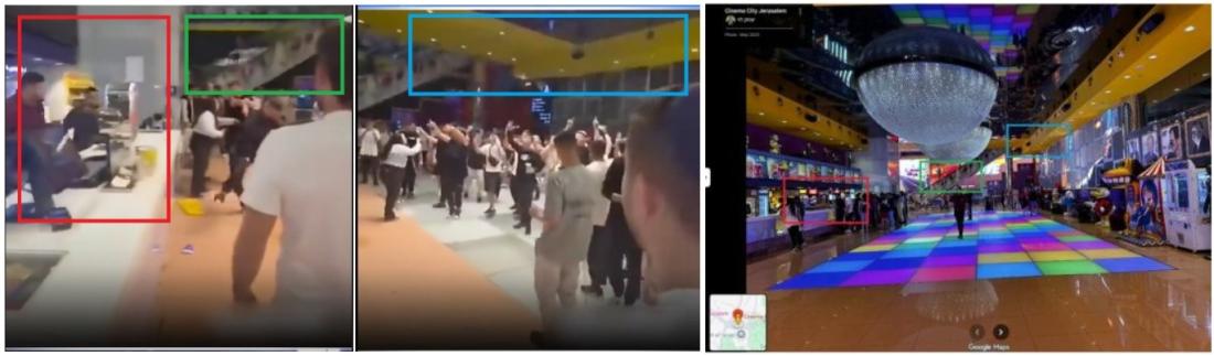 অসত্য ভিডিওর পটভূমিতে থাকা সিঁড়ি, হলুদ রঙের ছাদ এবং কাউন্টারসহ অনেকগুলো বৈশিষ্টের সাথে ২০২৩ সালে গুগল ম্যাপে প্রকাশিত সিনেমা হলের একটি ছবির মিল দেখা যায়(আর্কাইভ লিংক)।