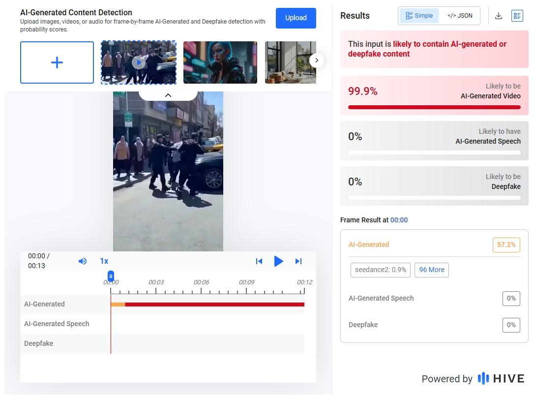 সনাক্তকরণ টুল হাইভ মডারেশনে ভিডিওটির আরও বিশ্লেষণে ফুটেজটি বানোয়াট হওয়ার প্রবল সম্ভাবনা দেখা যায়।