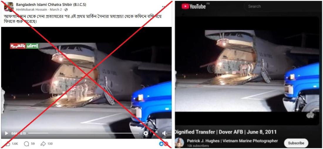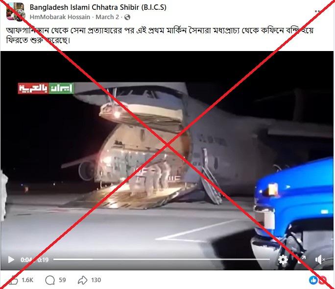 ফেসবুকে ২ মার্চ ২০২৬ তারিখে ছড়ানো একটি পোস্টের ক্যাপশনে বলা হয়, “আফগানিস্তান থেকে সেনা প্রত্যাহারের পর এই প্রথম মার্কিন সৈন্যরা মধ্যপ্রাচ্য থেকে কফিনে বন্দি হয়ে ফিরতে শুরু করেছে।”