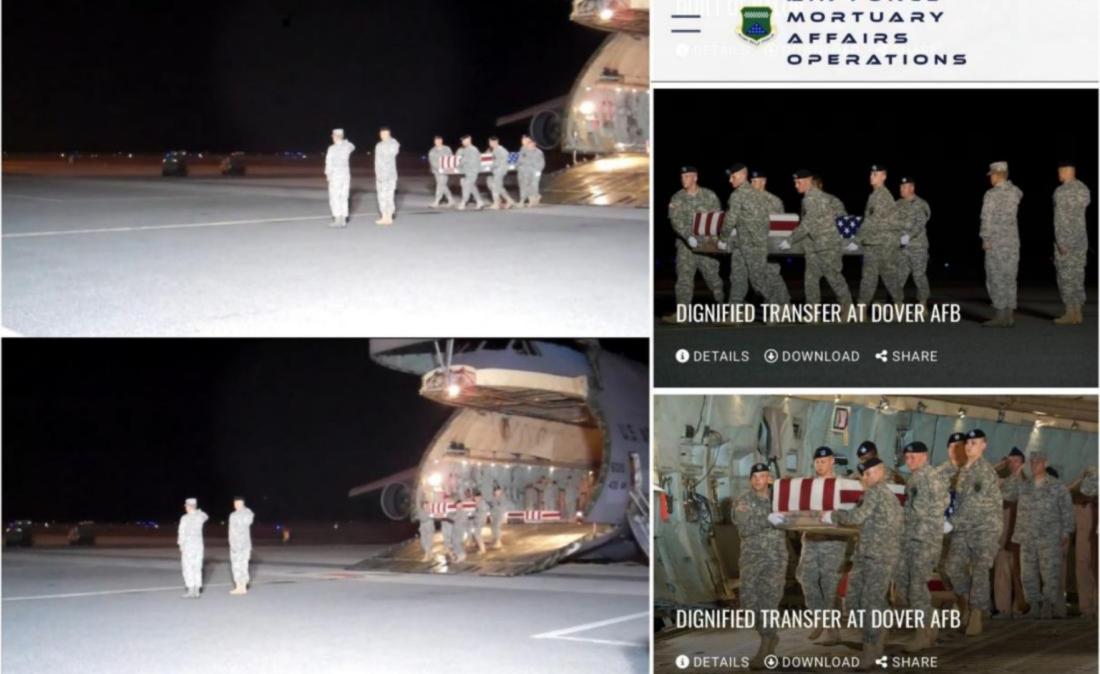 ভিডিওতে সৈন্যদেরকে একটি সামরিক বিমান থেকে আমেরিকার পতাকায় মোড়ানো কফিন বের করতে দেখা যায়।