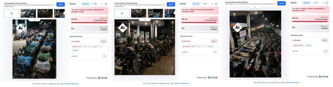 অন্যদিকে, এআই কন্টেন্ট সনাক্তকরণ টুল হাইভ মডারেশন ব্যবহার করে আরও বিশ্লেষণে দেখা যায়, ছবিগুলো এআই দিয়ে তৈরি হওয়ার প্রবল সম্ভাবনা রয়েছে।