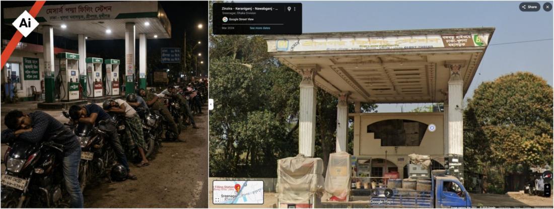 অসত্যভাবে ছড়ানো প্রথম ছবিটিতে বাংলা সাইনবোর্ডের লেখার একটি অংশ বিকৃত দেখা যায়। এছাড়া পাম্পের কর্মীদের হাত-পা ও গাড়িচালকদের মুখ অদৃশ্য কিংবা বিকৃত দেখায়।