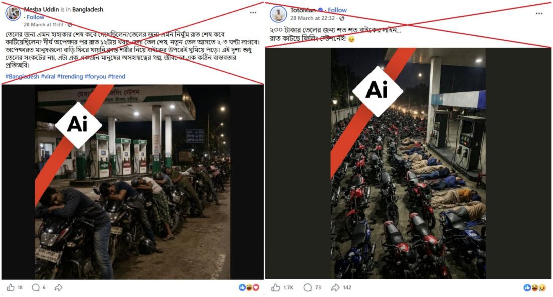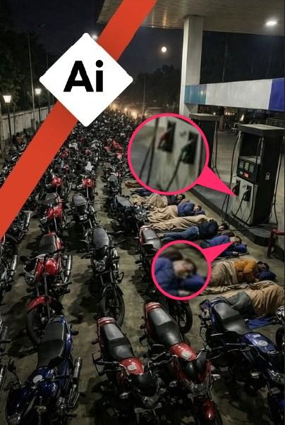 মধ্যপ্রাচ্যের যুদ্ধের কারণে হরমুজ প্রণালী কার্যত বন্ধ হয়ে গেছে। এতে আমদানি করা তেলের ওপর নির্ভরশীল বাংলাদেশে জ্বালানি সরবরাহ সংকুচিত হয়েছে। কিন্তু পেট্রল পাম্পে দীর্ঘ লাইনে গাড়িচালকদের ঘুমানোর দাবিতে অনলাইনে ছড়ানো ছবিগুলো এআই বা কৃত্রিম বুদ্ধিমত্তা দিয়ে তৈরি। দেশের বিভিন্ন জায়গায় ফিলিং স্টেশনে দীর্ঘ লাইন দেখা গেলেও, সামাজিক মাধ্যমে ছড়ানো ছবিগুলোতে অসংখ্য দৃশ্যগত ত্রুটি রয়েছে, যা এআই দিয়ে তৈরি হওয়ার সুস্পষ্ট লক্ষণ।