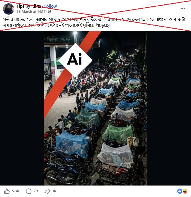 ফেসবুকে ২৯ মার্চ ২০২৬ তারিখে ছড়ানো একটি পোস্টের ক্যাপশনে বলা হয়, “গভীর রাতের তেল আসার সংবাদ পেয়ে শত শত বাইকের সিরিয়াল, বলেছে তেল আসতে এখনো ৩-৪ ঘন্টা সময় লাগবে। তাই ফিলিং স্টেশনেই অনেকেই ঘুমিয়ে পড়েছে।”